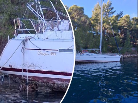 Ein Segelboot, das seit Jahren in Milna im Gebiet von Borić vor Anker liegt, hat allen Winden getrotzt, doch die jüngste starke Bora hat es in flaches Wasser getrieben. Unter Wasser ist das Boot stark bewachsen und sichtlich vernachlässigt.