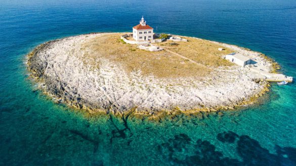 Viele Boote ankern gerne in der malerischen Bucht und genießen den Blick auf die Insel und den ikonischen Leuchtturm, der über die Adria wacht.